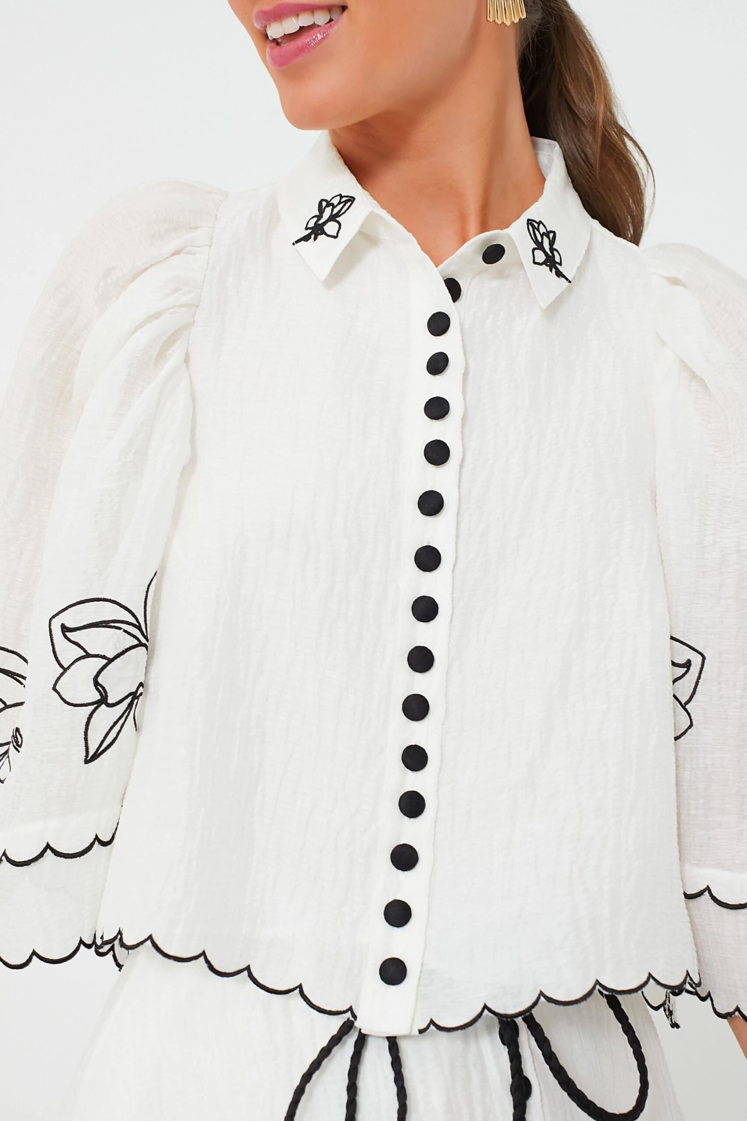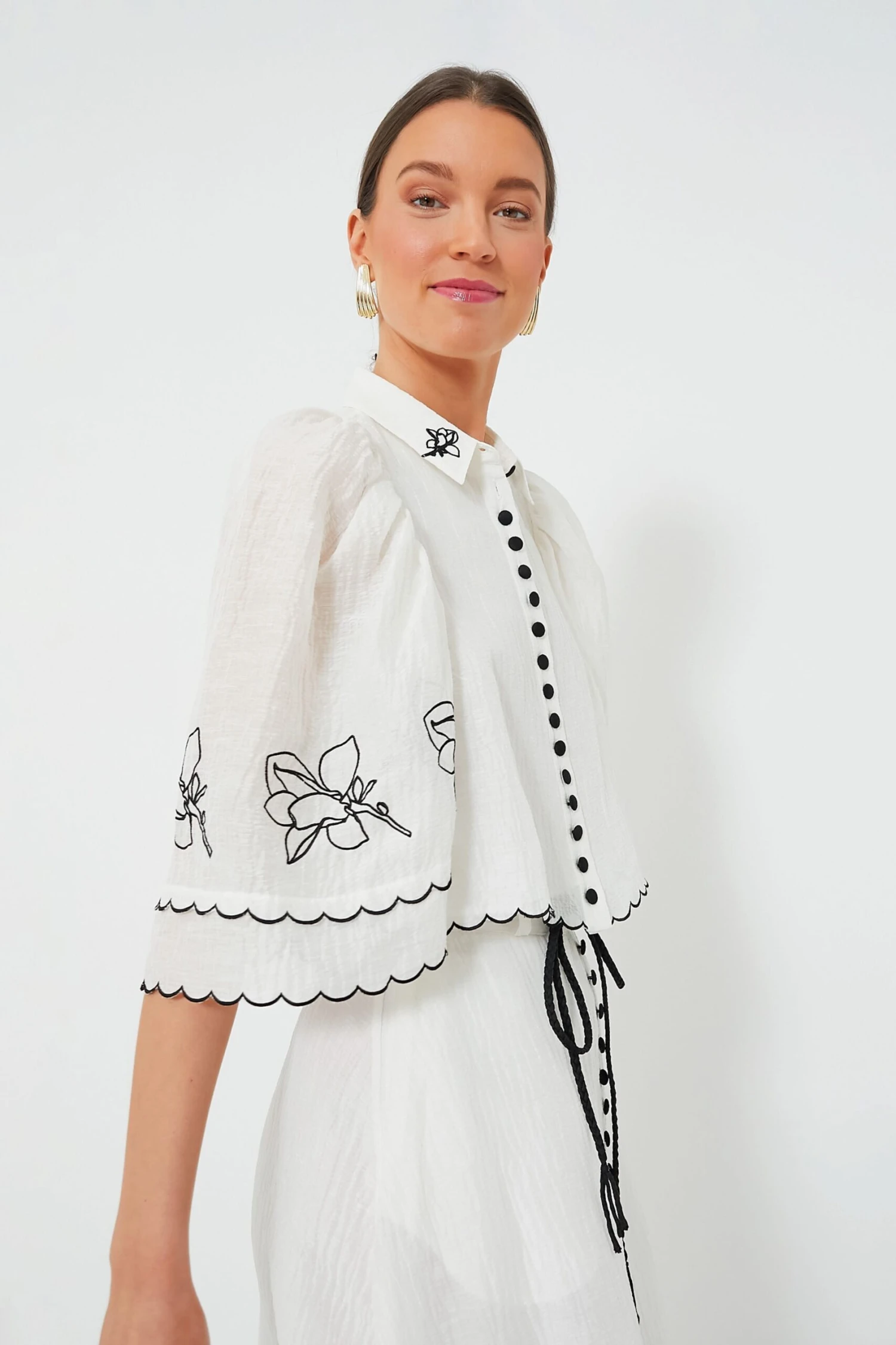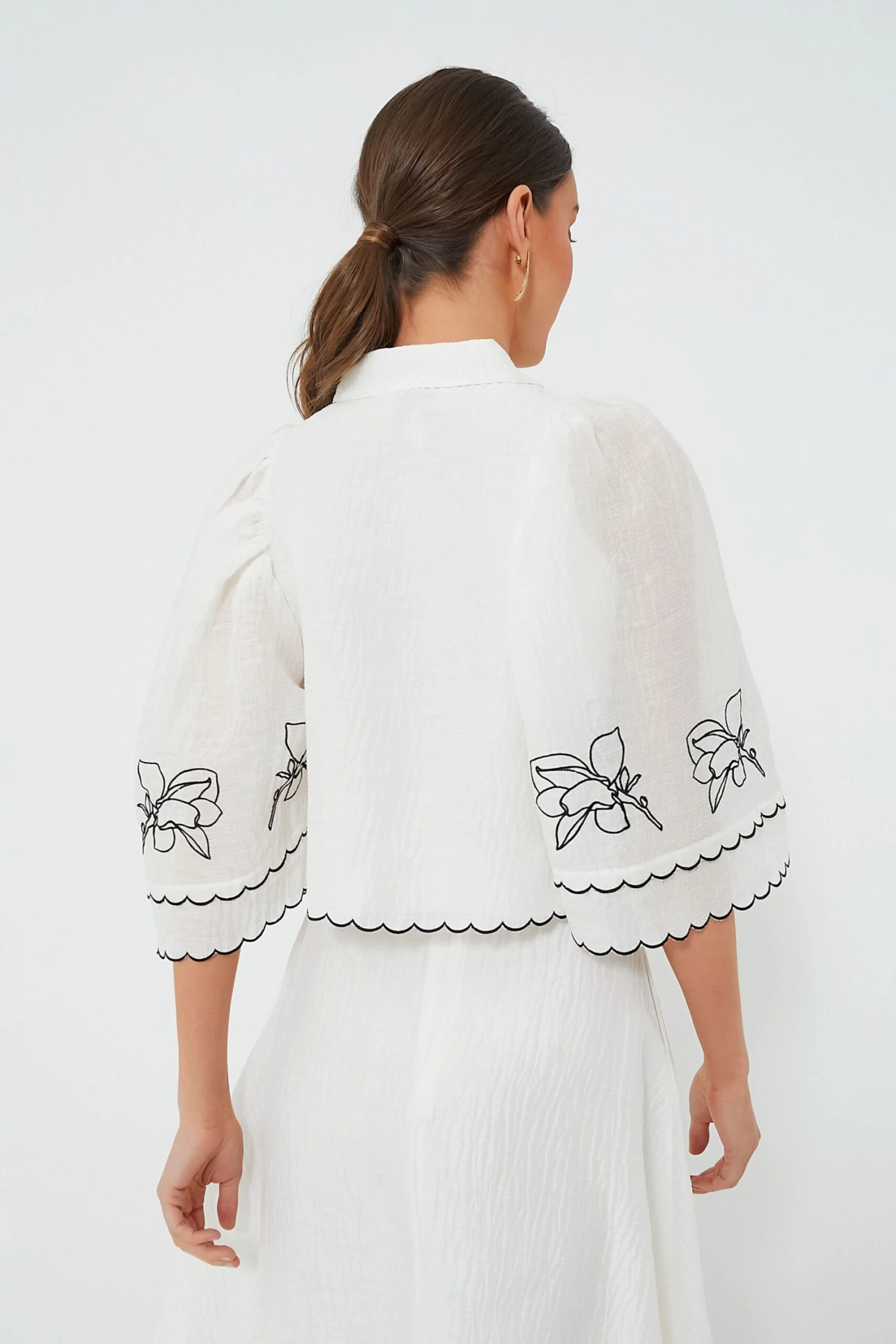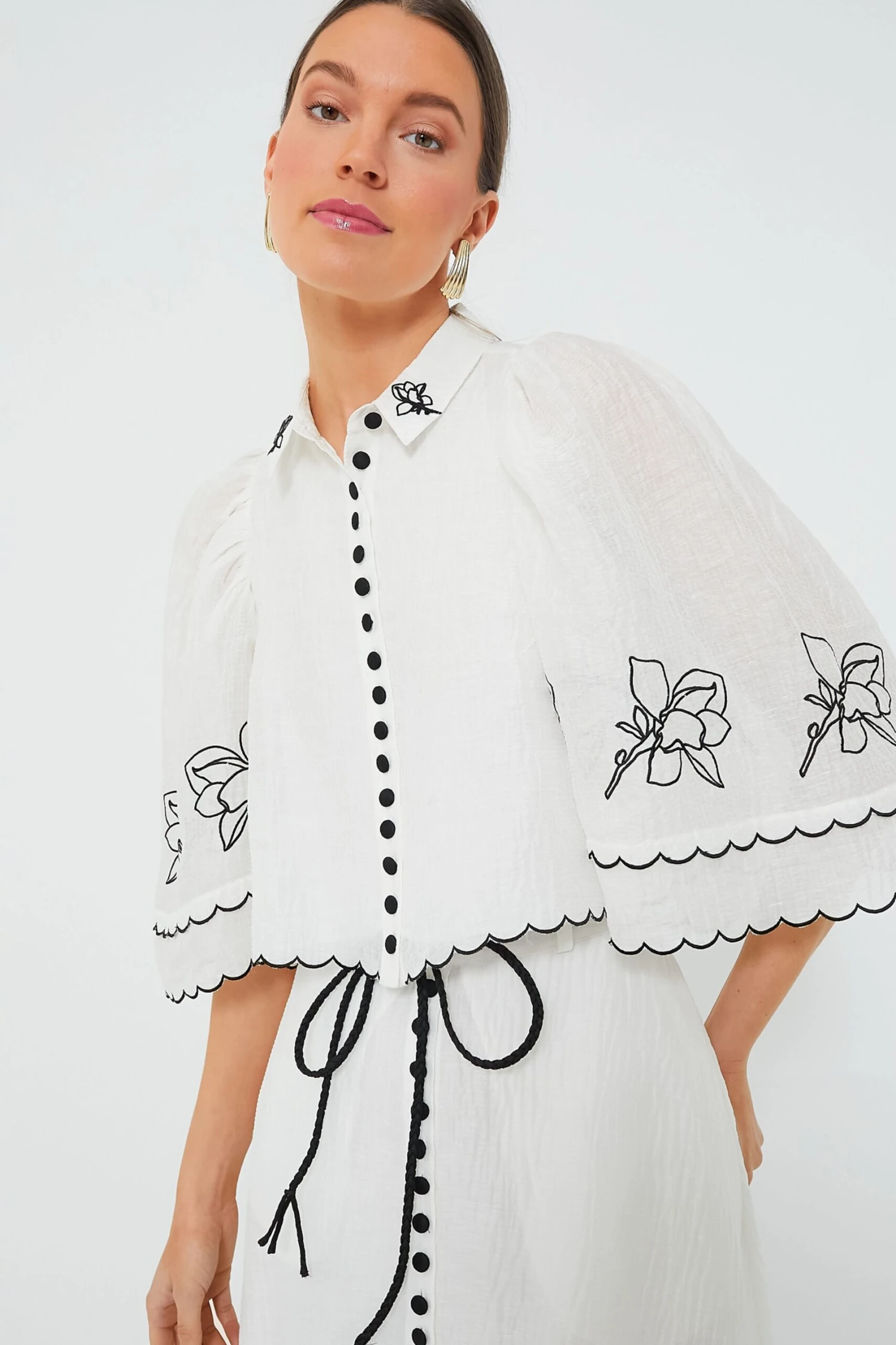 Effortlessly graceful, the Alba Black Gabriella Silk Linen Shirt is pure perfection. This top has a cropped fit with placement embroidery detailing, a classic collar, and short kimono style sleeves finished with scalloped edging. Dress down with denim and sandals, or pair with the Alba Black Grace Silk Linen Midi Skirt for a matching set that can carry you from luncheons to dinner parties with ease.