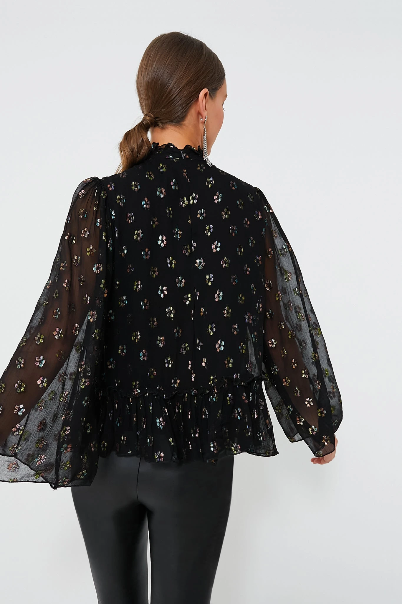 We are loving this subtly-playful Black Kala Peplum Blouse by Oliphant. Complete with a flattering silhouette, textured fabric, and a shimmering design, this top is eye-catching while still being elegant and versatile. The lightweight fabric ensures comfort, while the ruffle collar and hem add dimension and character. Style this with black pants and heels for a formal dinner party, or dress down with denim and ballet flats.