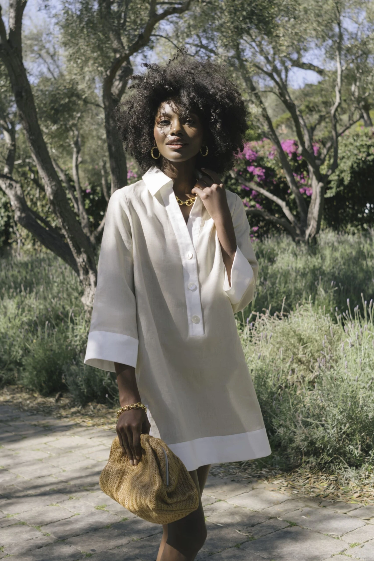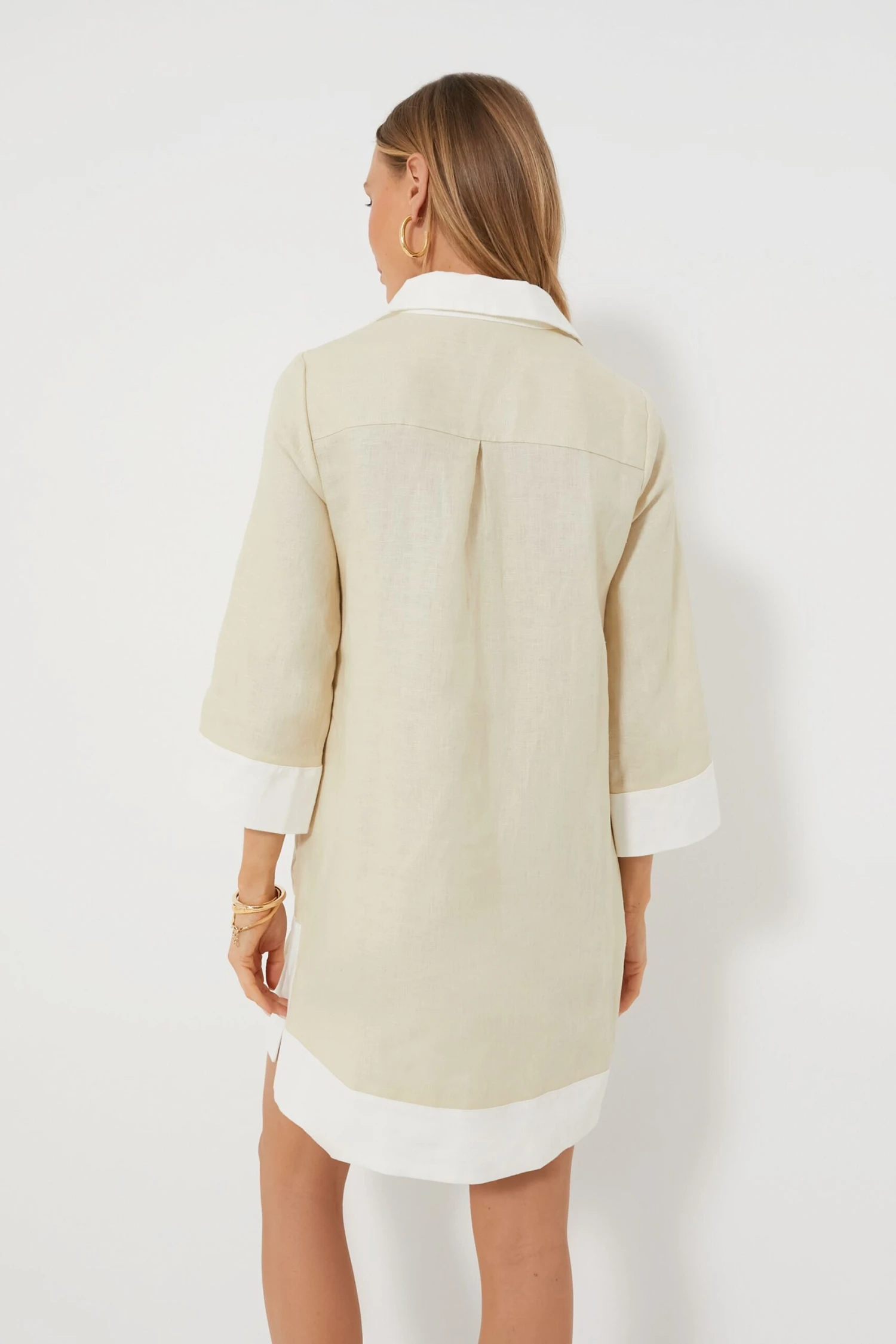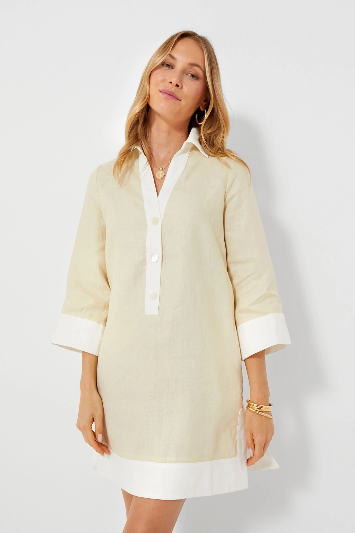 Is it the perfect day dress? Is it the chicest cover up? Is it the piece you will live in 24/7 when it’s so hot outside you curse anything that touches your body? It’s all of the above and so much more! The Champagne Collier Dress is composed of 100% linen and accented with color blocking trim and mother of pearl buttons all tied together in a swing shape that flatters and flows at the same time. The perfect piece to throw into your suitcase for that sweet vacation– from the beach to brunch, this mini is sure to be played on repeat.