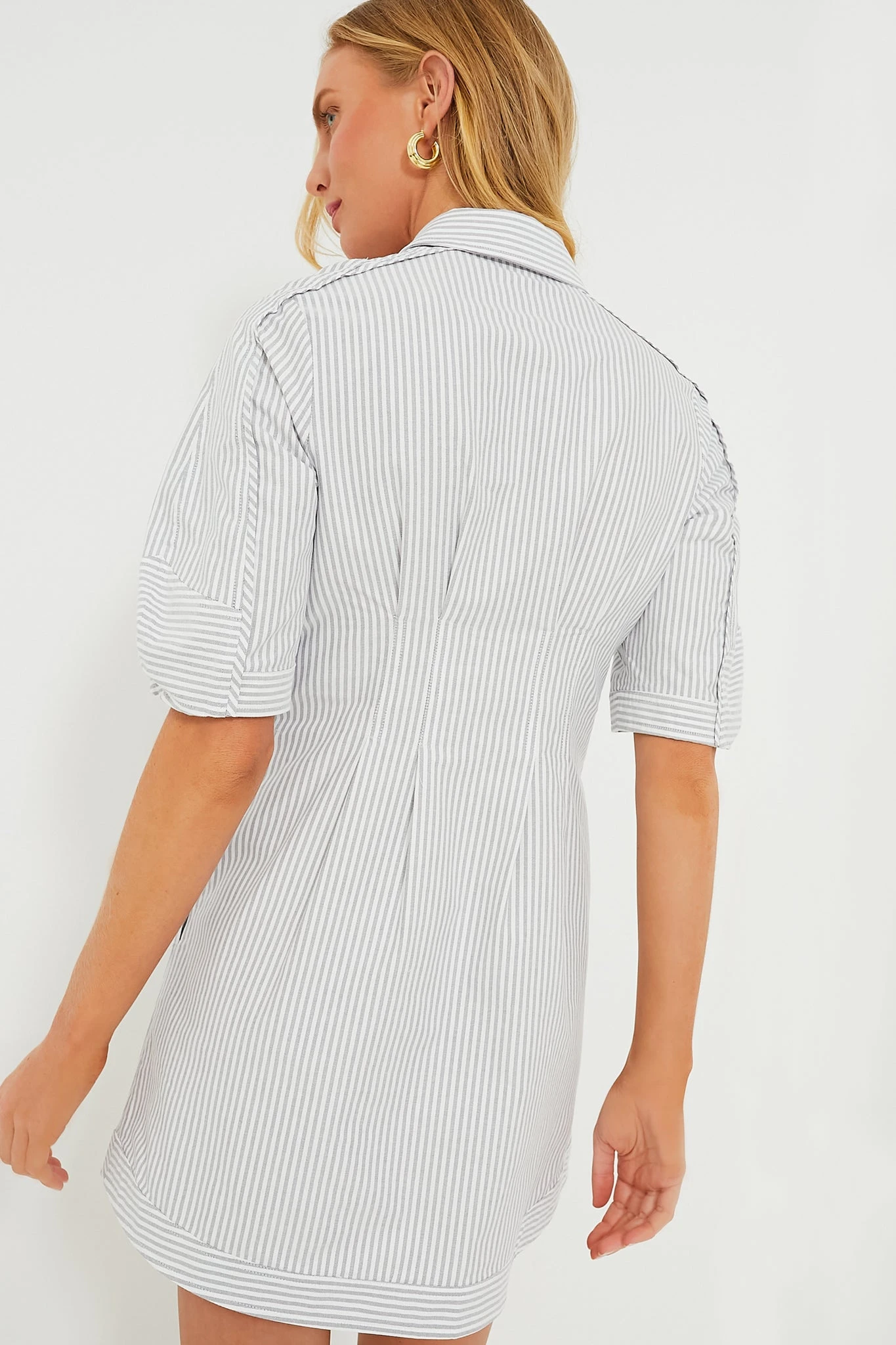 A simple silhouette with stunning details, the Midnight Stripe Percy Dress is a wardrobe classic. A crisp cotton fabric, timeless pinstriping, and a point collar all bring the sophistication while short puffed sleeves and a pleated waist create feminine flair. Easy to accessorize, there is no limit to where to wear or how to style this chic mini — a few of our favorites include with sandals for a picnic, with flats and sunnies for brunch, or with strappy heels and a clutch for an al fresco cocktail hour!