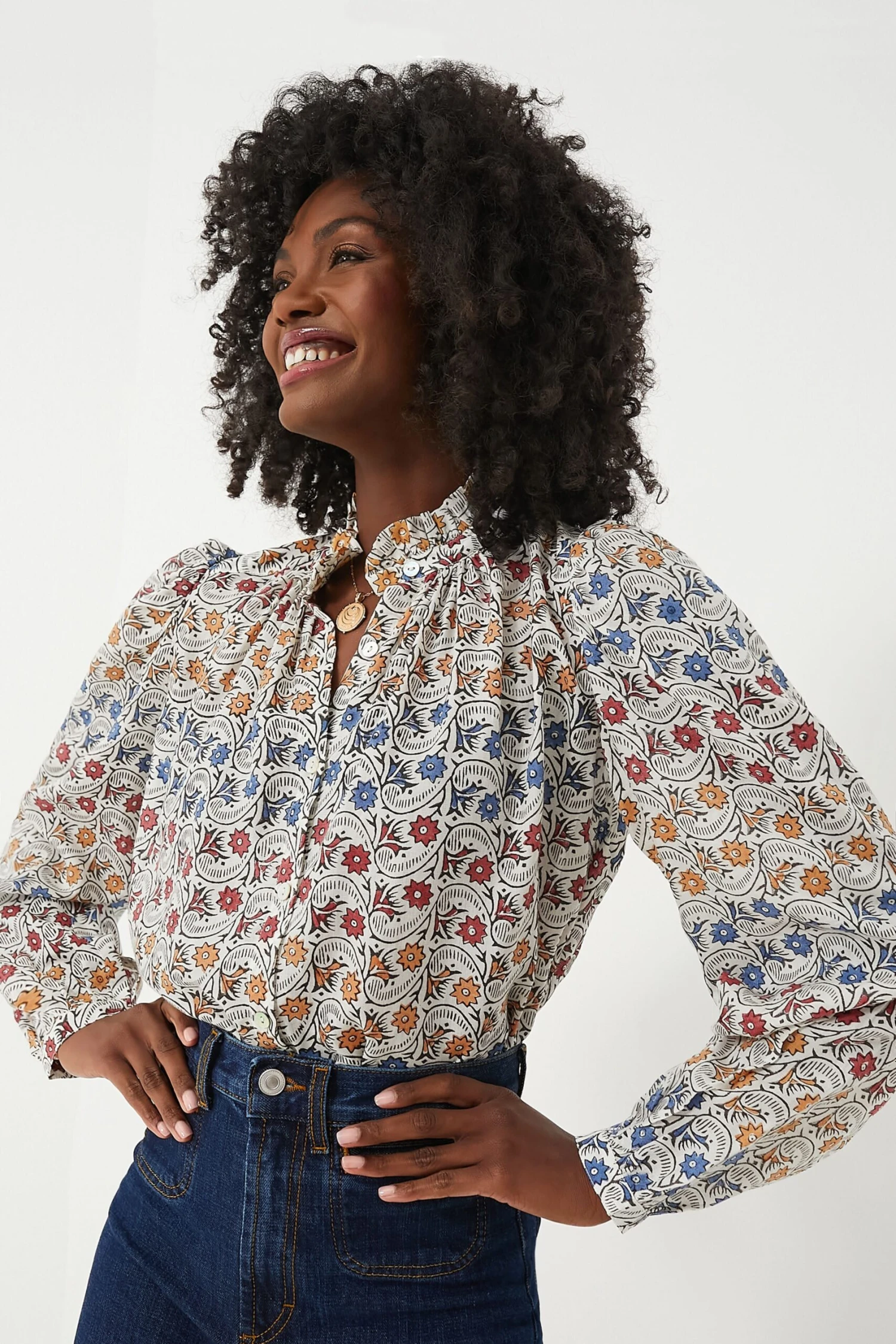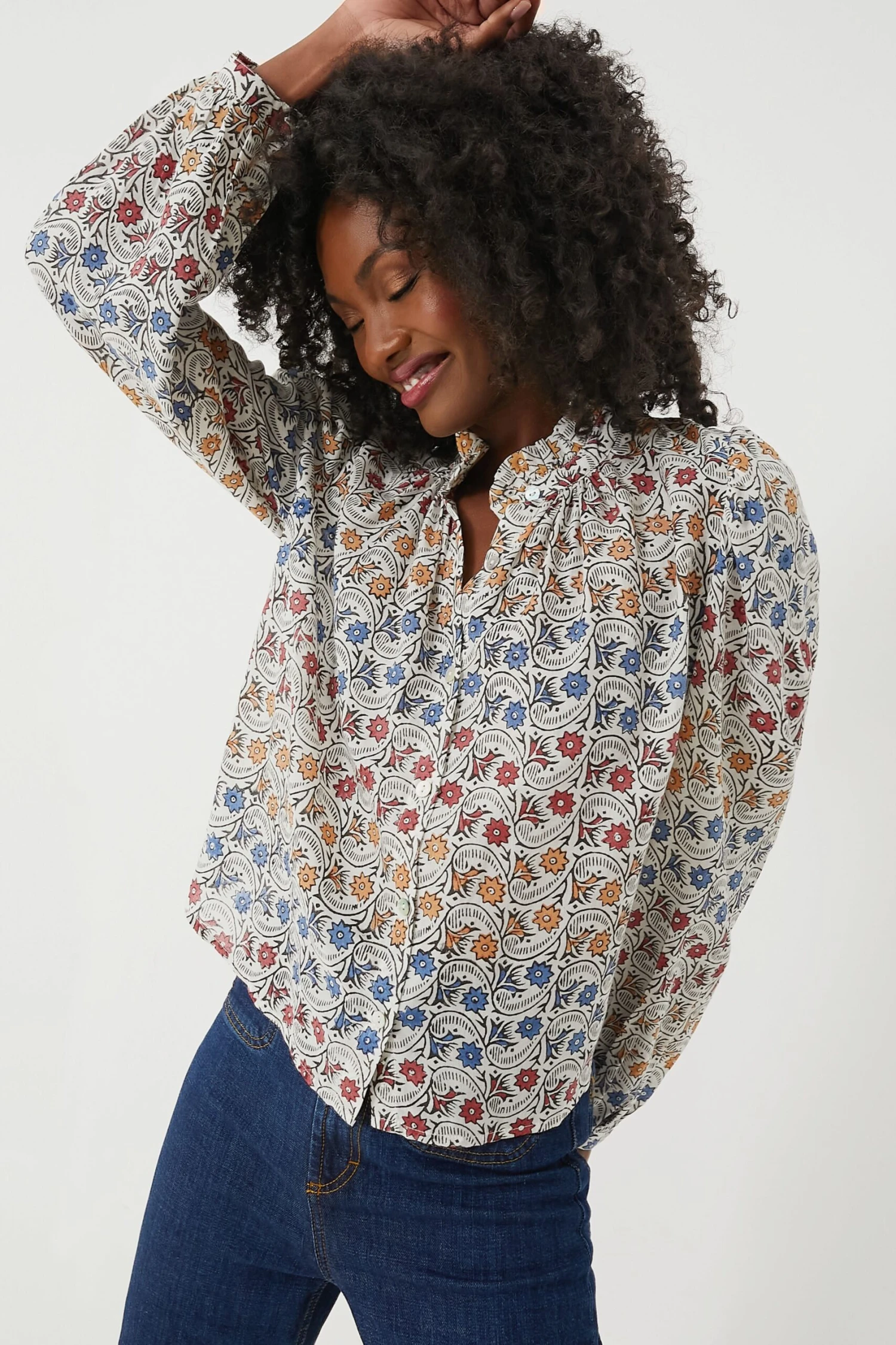 Blooming with rich hues and hand-block printed flowers, the charming Multi Wave Daisy Annabel Shirt is a staple in any season. Finishing touches include a ruffled stand collar, subtle puff shoulders, mother of pearl buttons down the placket, and a floaty fit that all come together to create an understated but elegant top. Made of lightweight and breathable tencel lyocell, this style is beautifully paired with trousers for an elevated ensemble or tried-and-true denim for a retro-inspired boho-chic look.