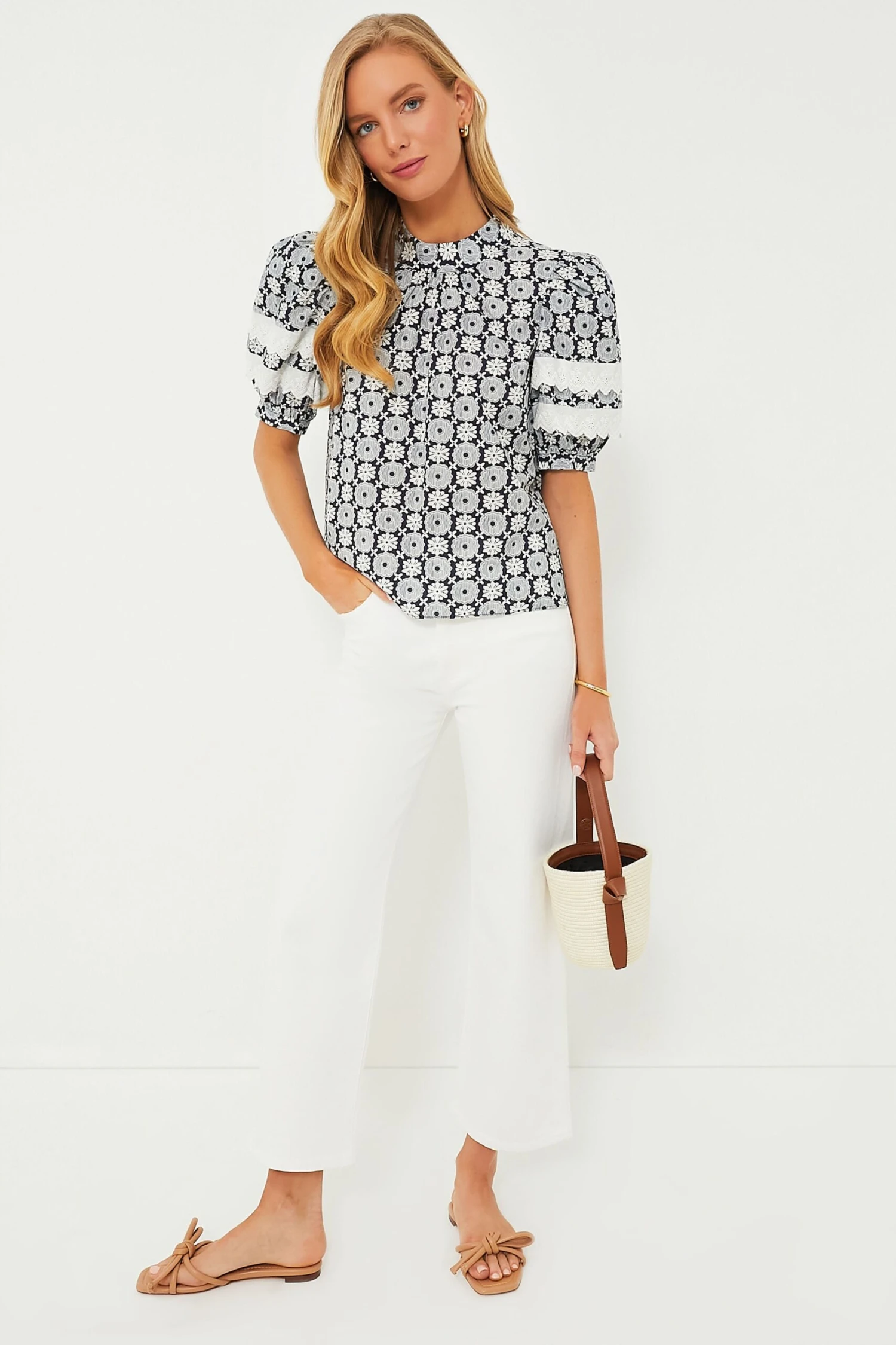 The Navy Geo Floral Gigi Blouse is an adorable, feminine style that is perfect for the warm-weather months. The flattering silhouette boasts large puff sleeves with eyelet bands, an eye-catching geometric pattern, and a high collar. An easy (yet elevated) throw-and-go style, we are pairing this with white pants and sandals or denim shorts and sneakers!