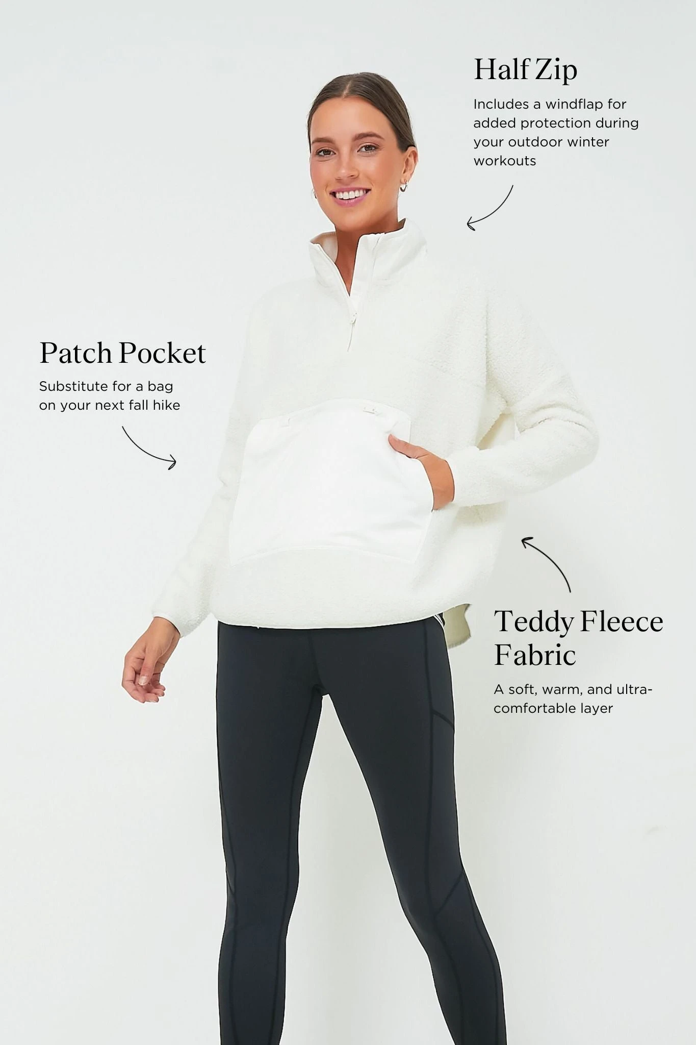 Super soft teddy fleece fabric meets functional style for the ultimate throw on and go number. The White Fleece Cady Quarter Zip is designed with a half zip and wind flap for added protection against cold weather and an additional patch pocket on top of a kangaroo pocket that makes for easy hands free hiking and adventures.